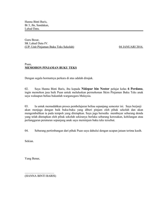 Surat Rasmi Permohonan Pinjaman Buku Teks Bukan Warganegara